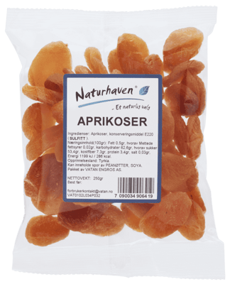 Naturhaven Aprikoser 250g fra NATUR HAVEN er et produkt innen Bakevarer og kjeks, Tørket frukt og nøtter, Aprikoser tørket. Produktet er tilgjengelig hos Coop til en pris av 29.90 kr. Produktet leveres av VATAN ENGROS AS. Produktet ble første gang registrert 9.1.2022 og sist oppdatert 16.7.2023. Prisen har holdt seg stabil på 29.90 kr.