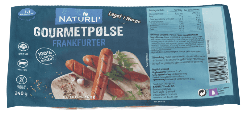 Naturli' Gourmetpølser 240g fra NATURLI' Produktet er tilgjengelig hos Coop til en pris av 57.90 kr. Produktet inneholder følgende allergener: Soya. Produktet leveres av ORKLA FOODS NORGE AS (STABBURET). Produktet ble første gang registrert 15.7.2022 og sist oppdatert 16.7.2023. Prisen har holdt seg stabil på 57.90 kr.