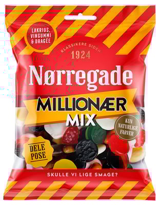 Nørregade Millionærmix 150g fra Nørregade Vekten er 150 g. Produktet inneholder følgende allergener: Gluten. Produktet leveres av SPANGSBERG CHOKOLADE AS. Produktet ble første gang registrert 11.6.2023 og sist oppdatert 6.9.2023.