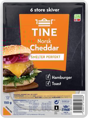 Norsk Cheddar Burgerost 150g Tine fra TINE Vekten er 150 g. Produktet inneholder følgende allergener: Melk. Produktet leveres av TINE SA. Produktet ble første gang registrert 11.6.2023 og sist oppdatert 6.9.2023.