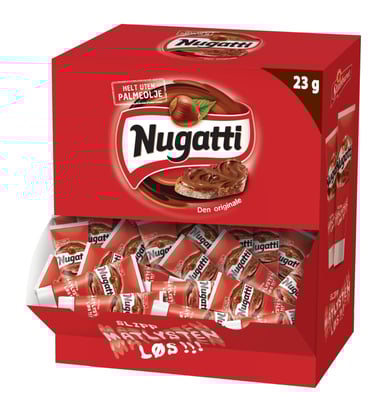 Nugatti Kuvert 23g fra Nugatti er et produkt innen Pålegg & frokost, Søtpålegg, Sjokoladepålegg. Produktet er tilgjengelig hos Meny til en pris av 9.50 kr. Vekten er 23 g. Produktet inneholder følgende allergener: Melk, Nøtter, Soya. Produktet leveres av Orkla foods norge as. Produktet ble første gang registrert 9.1.2022 og sist oppdatert 6.10.2023. Prisen har endret seg fra 8.90 kr til 9.50 kr over tid.