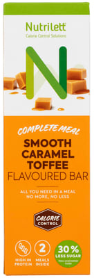 1. Nutrilett Smooth Caramel Toffee er en smaksrik måltidserstatter med deilig smak av myk karamell og sjokolade. Baren passer perfekt for deg som er på farten og ønsker et praktisk og kalorifattig måltid. Baren inneholder kun 207 kcal og har et høyt innhold av kostfiber og protein samt viktige vitaminer og mineraler kroppen trenger.