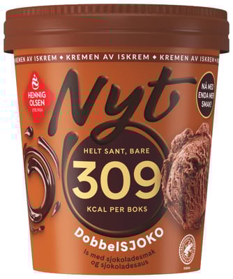 Nyt er en lettere iskrem laget med mindre fløte og sukker, med den rike og deilige smaken av ekte Hennig-Olsen iskrem. DobbelSJOKO er is med sjokoladesmak og sjokoladesaus, med kun 309 kcal per boks.