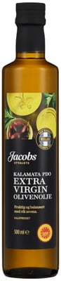 Jacobs Utvalgte Extra Virgin Kalamata olivenolje har en medium til sterk smak og medium bitterhet. Extra Virgin olivenolje er kaldpresset olivenolje som fremstilles ved å knuse oliven for å få saften fra fruktene. Den egner seg best i kalde retter, for eksempel salater og dressinger. Egner seg ikke for steking. Olivenolje er ferskvare og blir ikke bedre av lagring. Oppbevares mørkt med korken på, men aldri i kjøleskapet.