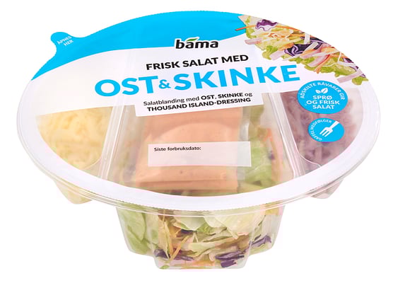 SALAT (51 %): isbergsalat, gulrot, mais og rødkål. THOUSAND ISLAND-DRESSING (18 %): rapsolje, vann, eddik, sukker, tomatkonsentrat, syltet agurk (agurk, vann, eddik, salt), salt, sennepspulver, eggeplommepulver (eggeplomme, salt, matodextrin), stabilisatorer (xanthangummi, propylenglykolalginat), krydder (løk, hvit pepper, allehånde, nellik, pepper ekstrakt), konserveringsmiddel (kaliumsorbat). OST (15,5 %): pasteurisert kumelk, syrekultur, salt, mikrobiell løpe og surhetsregulerende middel (kalsiumklorid). SKINKE (15,5 %): svinekjøtt, vann, kollagenfiber, salt, stabilisator (kaliumklorid, natrium og kalium di- og trifosfater), surhetsregulerende middel (kaliumlaktat, karrgenan, kaliumklorid), dekstrose, fortykningsmiddel (xantangummi), solsikkeolje, krydderurter, smaksforsterker natriumglutamat, hvitløk, sukker, herdet rapsolje, antioksidant (natriumaskorbat), konserveringsmiddel (natriumnitritt).