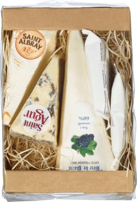 Tre franske oster samt to pakker kjeks, perfekt som snacks for fire personer.