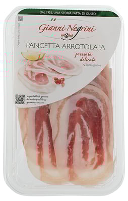 Pancetta Arrotolata Affettata 80g Negrini fra Negrini er et produkt innen Pålegg & frokost, Spekemat, Spekeskinker. Vekten er 80 g. Produktet leveres av OLUF LORENTZEN AS. Produktet ble første gang registrert 11.6.2023 og sist oppdatert 6.9.2023.
