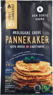 Den Sorte Havre består av nabobønder i Østfold som dyrker svarthavre. Her har vi tatt frem en økologisk pannekakeblanding uten bruk av hvetemel i det hele tatt, men bare med norsk urhavre, norske egg og norsk melk. Denne økologisk pannekakeblandingen trenger man bare å tilsette 7 dl vann for å kunne lage 8-10 nydelige pannekaker, mye sunnere og mer velsmakende (synes vi) enn de vanlige alternativene.