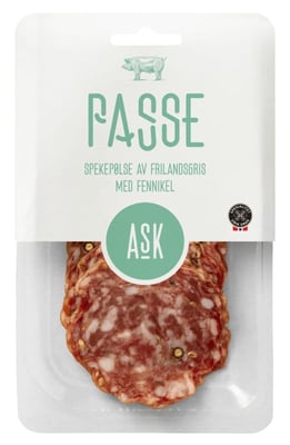 Passe er en italiensk inspirert salami med fenikkel og grønn pepper. Rund og smaksrik spekepølse som #passer" til alt fra tapas, på brødskiva eller sammen med god ost. Vinner av NM gull i 2022. Laget av norsk utegris, ingen kunstige tilsetningstoffer eller nitrit