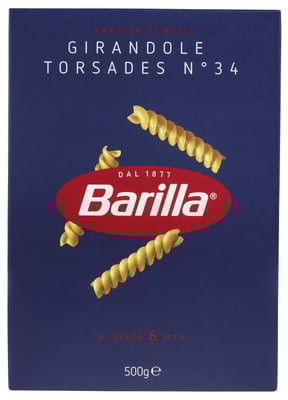 Girandole Torsades pasta fra Barilla er den nettere varianten av den mer kjente formen Fusilli. I tillegg til å være en liten og nett, kort pasta, har Girandole pastaskruer også kortere koketid enn Fusilli pasta (6 minutter). Girandole-pasta fra Italia passer, takket være sin delikate form, perfekt i for eksempel salater og supper.