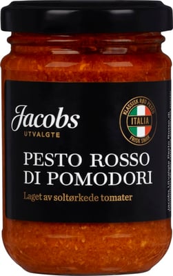 Den røde Pesto Rosso er laget av soltørkede tomater, Peccorino og Grana Padano-ost. God som dressing til salaten eller som marinade til poteter, fisk og kjøtt.