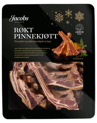 Jacobs Utvalgte røkt pinnekjøtt er et velsmakende pinnekjøtt av Jæren Smak-lam. Salting, modning og tørking er håndverksmessig gjort og basert på lokale oppskrifter og historiske tradisjoner. Serveres med tradisjonelt tilbehør som mandelpoteter, ekte voss