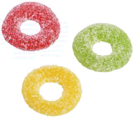 Sukker, glukose-fruktosesirup, gelatin , surhetsregulerende middel (E296), aromaer, fargestoff (E100, E120, E131).
