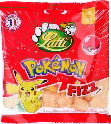 Lutti Pokemon Fizz inneholder myke, syrlige gelegodterier formet som Pokemonfigurer med smak av blant annet eple, kaktus, sitron, cola og tropisk smak. Lisensiert og unikt samarbeid.
