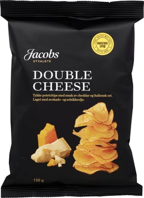 Tykke potetchips med en deilig smak av double cheese. Jacobs Utvalgte potetchips er knasende sprø chips med skall, laget på råvarer av høyeste kvalitet og rik på smak.
