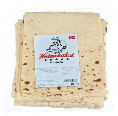 Potetlefse fra Potetlefse Vekten er 550 g. Produktet inneholder følgende allergener: Gluten, Melk, Sulfitt. Produktet leveres av HEIMEBAKST AS. Produktet ble første gang registrert 11.6.2023 og sist oppdatert 6.9.2023.