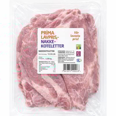 Prima lavpris nakkekoteletter fra Prima lavpris Vekten er 1.03 kg. Produktet leveres av Nordfjord Kjøtt AS for REMA 1000 AS. Produktet ble første gang registrert 30.3.2026 og sist oppdatert 30.3.2026.