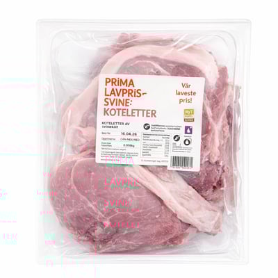 Prima Lavpris svinekoteletter fra Prima Lavpris Vekten er 0.998 kg. Produktet leveres av Nordfjord Kjøtt AS for REMA 1000 AS. Produktet ble første gang registrert 30.3.2026 og sist oppdatert 30.3.2026.