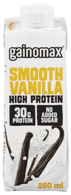 Gainomax Smooth Vanilla High Protein Drink er en melkebasert proteindrikk med smak av vanilje og uten tilsatt sukker, Miljøvennlig emballasje! Passer godt som mellommåltid og for deg som ønsker å tone kroppen og holde karbohydratinntaket nede.