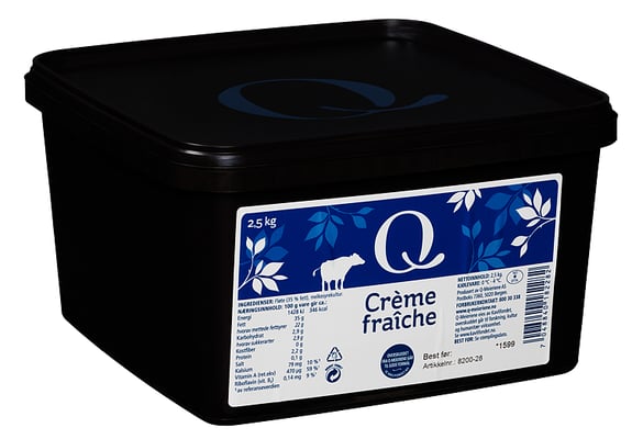 Q Creme Fraiche 2,5kg Q fra Q Vekten er 2.5 kg. Produktet inneholder følgende allergener: Melk. Produktet leveres av Q-MEIERIENE AS. Produktet ble første gang registrert 11.6.2023 og sist oppdatert 6.9.2023.