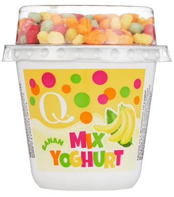 Q Mix er førstevalget når barna får velge yoghurt. Yoghurten har smak av banan, og det fargerike strøsselet i lokket tilfører smak og lekenhet til yoghurten
