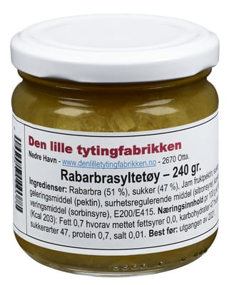 Rabarbrasyltetøy fra Dlt¤Den lille tytingfabrikken Vekten er 240 g. Produktet leveres av GUDBRANDSDALSMAT SA. Produktet ble første gang registrert 11.6.2023 og sist oppdatert 6.9.2023.