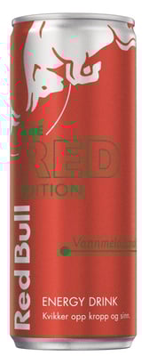 Red Bull Energidrikk Red Edition 250 ml kvikker opp kropp og sinn, og gir deg vinger når du trenger det: uansett om du haster fra jobb til trening eller har en rolig utekveld med venner. Red Bull Editions kombinerer vingene fra Red Bull med ulike smaker. Red Edition inneholder ingredienser av samme høye kvalitet som Red Bull Energy Drink, og komplementerer Red Bull familien med smak av vannmelon. Red Bull har gitt vinger til folk og ideer siden midten av 1980-tallet, hvor grunnleggeren ikke kun utviklet et nytt produkt, men ga liv til en helt ny produktkategori; energidrikker. Høyt koffeininnhold. Anbefales ikke for barn, gravide og personer som ammer (32mg/100ml). Konsumeres i moderate mengder. Serveres iskald.