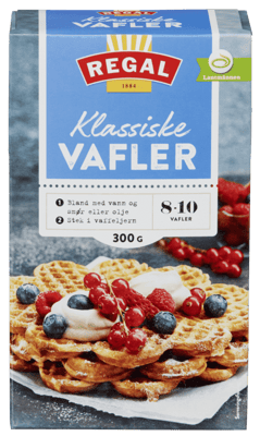 Regal Vafler 300g fra REGAL Produktet er tilgjengelig hos Coop til en pris av 21.50 kr. Produktet leveres av LANTMANNEN CEREALIA AS. Produktet ble første gang registrert 9.1.2022 og sist oppdatert 16.7.2023. Prisen har holdt seg stabil på 21.50 kr.