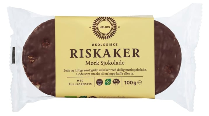 Helios Riskaker Mørk Sjokolade er økologiske riskaker med deilig mørkt sjokoladetrekk. Lett og luftig. Gode som snacks til en kopp kaffe eller te.