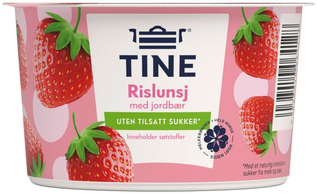 TINE® Rislunsj™ Jordbær UTEN er en kremet og smakfull¿risgrøt med frisk jordbærsaus uten tilsatt sukker, kun med et naturlig innhold av sukker fra melk og frukt. Inneholder søtstoff.