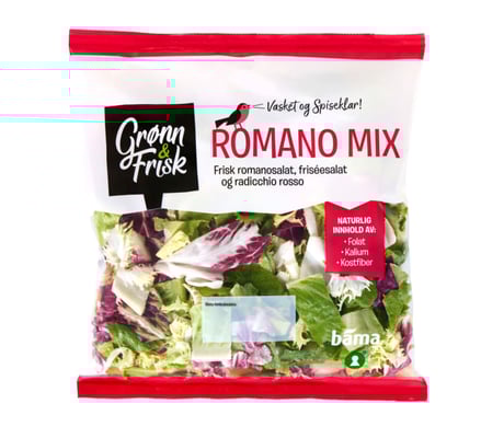 Romano Mix er en sprø og frisk salatblanding av romanosalat, friséesalat og radicchio rosso. Salatmiksen er vasket, kuttet og helt spiseklar. Enklere blir det ikke. Prøv ved siden av middagen eller som Cæsarsalat.