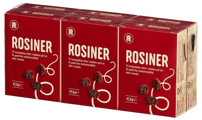 Rosiner 6pk, 249 g fra REMA 1000 Produktet er tilgjengelig hos Oda til en pris av 25.30 kr. Vekten er 249 g. Produktet leveres av Rema 1000. Produktet ble første gang registrert 9.1.2022 og sist oppdatert 7.10.2023. Prisen har endret seg fra 23.70 kr til 25.30 kr over tid.