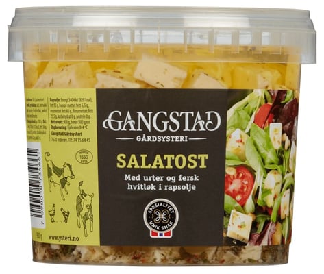 Salatost 900g Gangstad fra Gangstad er et produkt innen Ost, Fetaost. Produktet er tilgjengelig hos Meny til en pris av 219.00 kr. Produktet inneholder følgende allergener: Melk. Produktet leveres av Gangstad gårdsysteri. Produktet ble første gang registrert 11.6.2023 og sist oppdatert 3.8.2023. Prisen har holdt seg stabil på 219.00 kr.