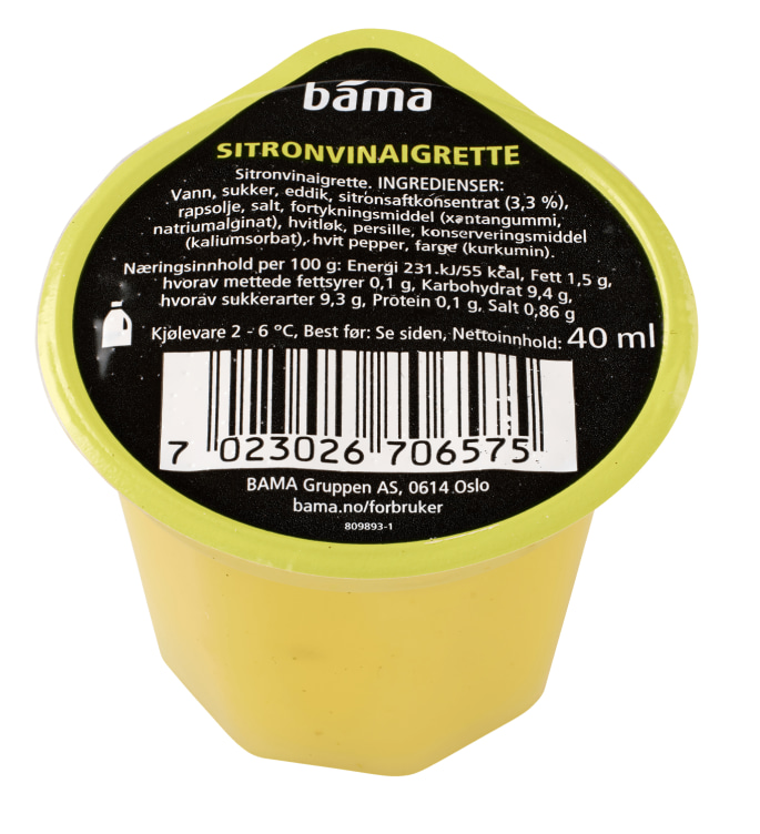 Sitronvinaigrette 40g Bama fra Bama er et produkt innen Frukt & grønt, Grønnsaker, Salater. Produktet koster 9.90 kr. Vekten er 40 g. Produktet leveres av Bama dagligvare as. Produktet ble første gang registrert 8.3.2026 og sist oppdatert 14.3.2026.