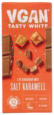 Vi fant ingen skikkelig gode veganske sjokolader på markedet som kun var laget for kos. Vårt slagord er «smaken teller», og for oss er smaken det aller viktigste. Denne sjokoladen er utviklet av sjokoladeelskere for sjokoladeelskere. Den er smakt, justert, og smakt og justert på ny. VGAN Salt karamell er nemlig en helt unik sjokoladeopplevelse som bare må oppleves. Dette er et perfekt vegansk alternativ en kveld der du bare MÅ ha noe ekstra. Den karakteristiske smaken får man av en nydelig kombinasjon av kokosblomstnektar og ristede mandler. Det er også denne kombinasjonen som gir den nydelige fargen.