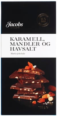 Mørk sjokolade med biter av karamell, mandler og et lite dryss havsalt. Jacobs Utvalgte mørk sjokolade har et høyt kakaoinnhold og er en fyldig sjokolade med god, lang ettersmak.