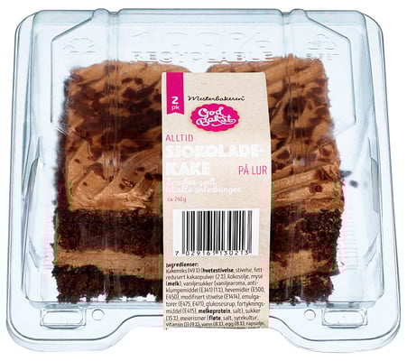 Kakemiks (hvetestivelse, stivelse, fettredusert kakaopulver (2 %), kokosolje, myse (melk), vaniljesukker (vaniljearoma, antiklumpemiddel (E 341)) (1 %), hevemidler (E 500, E 450), modifisert stivelse (E 1414), emulgatorer (E 475, E 471), glukosesirup, fortykningsmiddel (E 415), melkeprotein, salt) (49 %), sukker (15 %), meierismør (fløte, salt, syrekultur, vitamin D) (9 %), vann (8 %), egg (8 %), rapsolje, kaffe, strøssel (sukker, kakaopulver, kakaosmør, dextrose, emulgator (E 322 soyalecitin)).