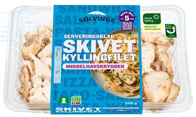 Kyllingfilet* (93 %), krydder (dekstrose (mais), hvitløk, aroma (eddik, gouda, kylling), glukose (mais), pepper, chili, gjærekstrakt, persille, sitronkonsentrat, rapsolje, timianekstrakt), salt, surhetsregulerende middel (E262), potetstivelse, emulgator (E451i), stabilisator (E450, E451), dekstrose (mais), antioksidant (E301), aroma.
