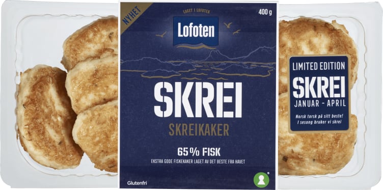 Lofoten Skreikaker er laget med mest skrei og litt hyse. Denne kombinasjonen gir skreikakene en ekstra saftig og god konsistens. Lofoten Skreikaker er kun tilgjengelig i sesong og er laget med naturlige råvarer. Skreikakene er laget i Lofoten.