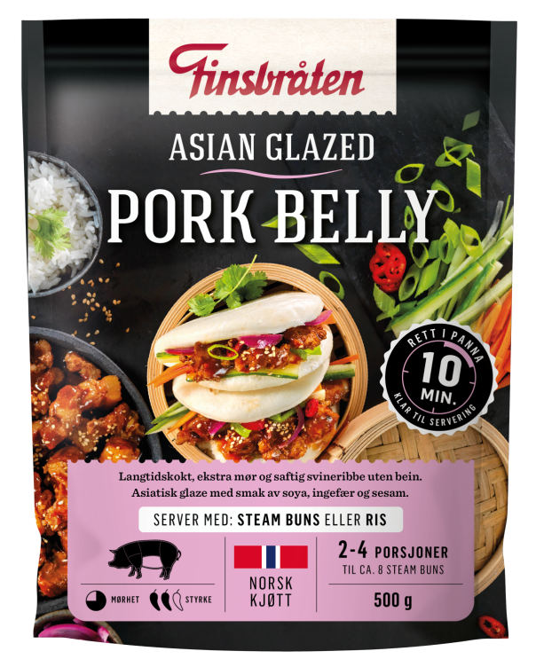 Finsbråten slow cooked pork belly asian sticky er laget av langtidskokt strimlet norsk svineribbe uten bein. Mørt og saftig kjøtt i asiatisk glaze med smak av soya, ingefær og sesam. Perfekt for ekstra gode steam buns, til ris eller i wok