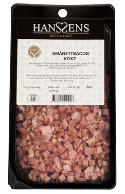 Smårettbacon Kokt Ternet Hanssens fra Hanssens Vekten er 0.25 kg. Produktet leveres av H A HANSSEN A/S. Produktet ble første gang registrert 11.6.2023 og sist oppdatert 6.9.2023.