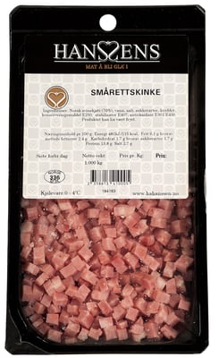 Smårettskinke Ternet Pk Hanssens fra Hanssens Vekten er 0.25 kg. Produktet leveres av H A HANSSEN A/S. Produktet ble første gang registrert 11.6.2023 og sist oppdatert 6.9.2023.
