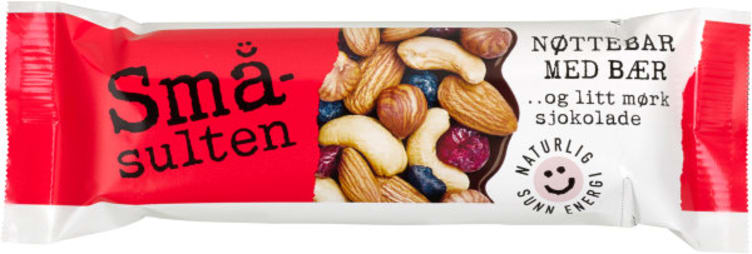 Småsulten Bar Nøtter&Bær 44g fra Småsulten Produktet er tilgjengelig hos Meny til en pris av 21.50 kr. Produktet leveres av Orkla confectionery & snacks norge as. Produktet ble første gang registrert 9.1.2022 og sist oppdatert 16.7.2023. Prisen har holdt seg stabil på 21.50 kr.