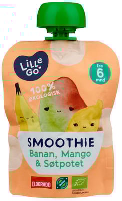 LilleGo' smoothie med banan, mango og søtpotet. Produktet er laget av økologiske råvarer og passer for barn over seks måneder.
