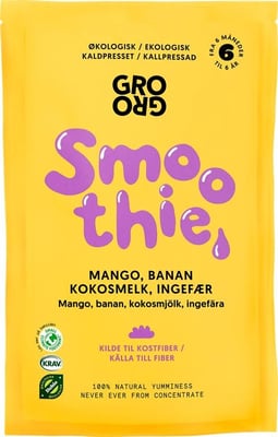 Fersk fruktpurè med banan, mango, kokosmelk, ananas og ingefær. Med hjelp av kaldpressing beholdes/ivaretas næringen og den gode smaken. Helt uten fruktjuicekonsentrat og varmebehandlet fruktpurè for å sikre høy kvalitet. Uten sugetut for bedre utvikling av munnmotorikk. Utviklet i Norge. Kjøleprodukt!