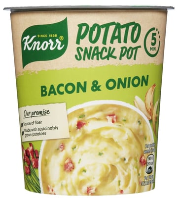 Snack Pot Potet m/Bacon & Løk er et deilig og praktisk minimåltid som er raskt å tilberede: tilsett kokende vann i koppen, ha igjen lokket, og maten er klar på fem minutter. Prøv også våre andre Knorr Snackpot smaksvarianter!