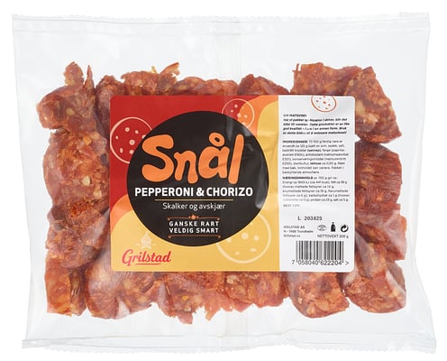 Snål Pepperoni & Chorizo Skalker og Avskjær 200g fra Grilstad Vekten er 200 g. Produktet inneholder følgende allergener: Melk, Sennep. Produktet leveres av GRILSTAD AS. Produktet ble første gang registrert 11.6.2023 og sist oppdatert 6.9.2023.