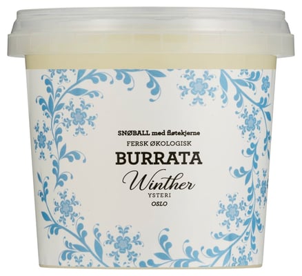 Norskprodusert burrata med fløtekjerne håndlaget på økologisk kumelk.