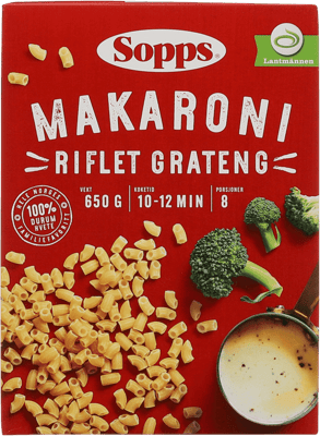Sopps Riflet Grateng Makaroni 650g fra SOPPS Produktet er tilgjengelig hos Coop til en pris av 37.90 kr. Produktet inneholder følgende allergener: Gluten. Produktet leveres av LANTMANNEN CEREALIA AS. Produktet ble første gang registrert 9.1.2022 og sist oppdatert 16.7.2023. Prisen har holdt seg stabil på 37.90 kr.
