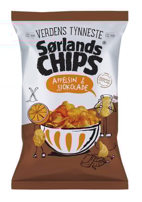 Verdens Tynneste Sørlandschips Appelsin & Sjokolade, en chips for hele familien. Vårt tynneste potetgull toppet med den unike kombinasjonen av appelsin og sjokolade. 1,22 mm tynn potetchips, finkuttet med presisjon for å gi deg den tynneste Sørlandschipse